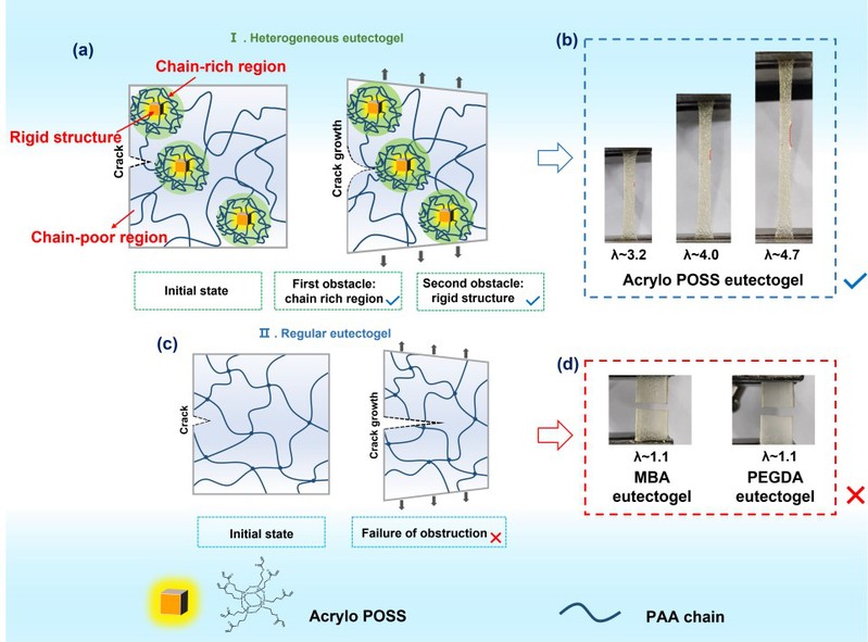 该研究聚焦于凝胶类软材料在大变形下易发生裂纹扩展的关键难题,创新设计并制备了一种具有非均相聚合物网络的POSS基凝胶复合材料。该材料展现出卓越的抗裂纹扩展能力,兼具低滞后性、强附着力以及优异的防冻性能(可适应低至-40°C的环境)。基于该凝胶开发的柔性传感器在宽温域范围内均表现出稳定的应变响应性能,为开发耐缺陷、适应极端环境的柔性传感器件提供了新思路。
